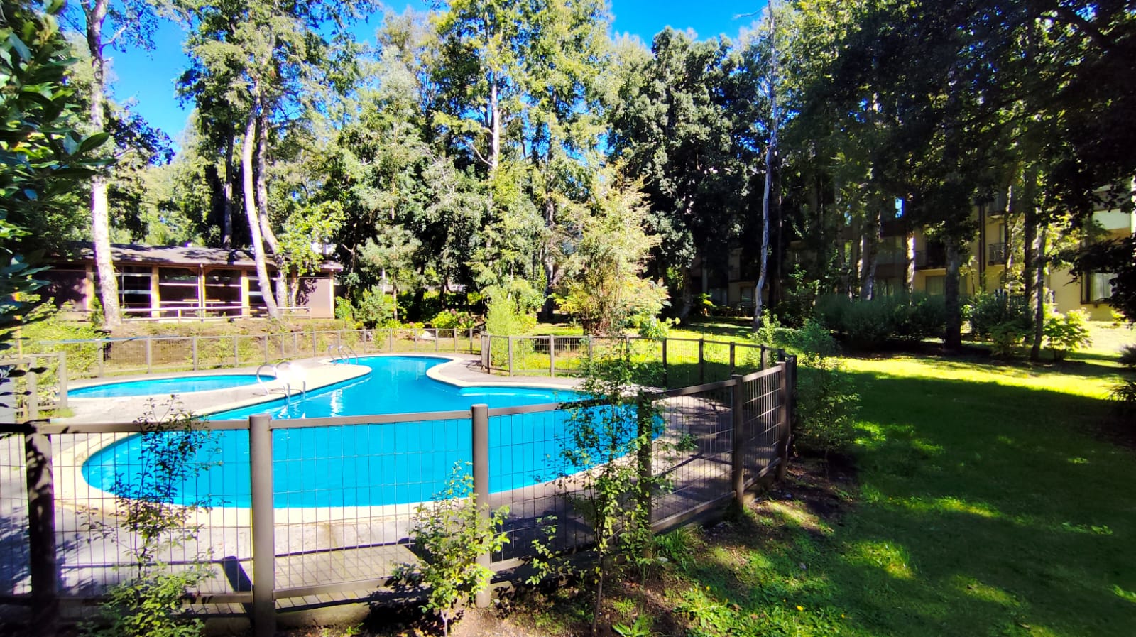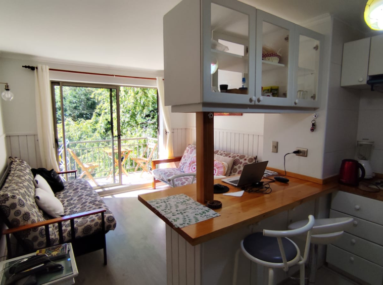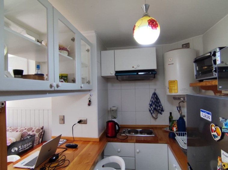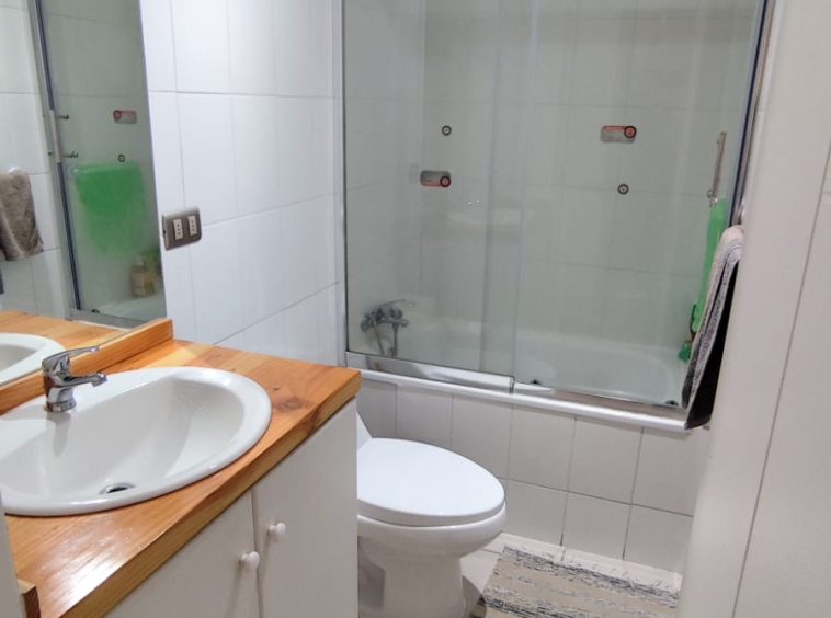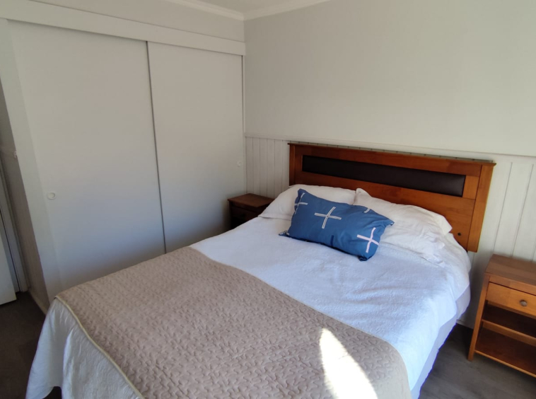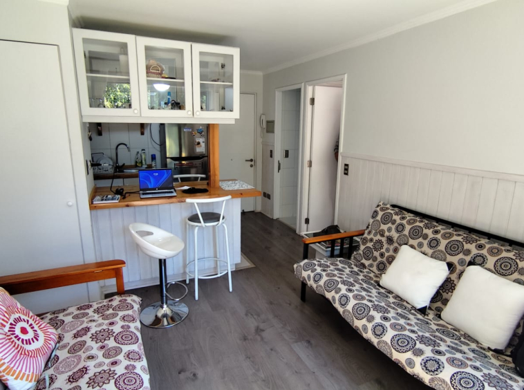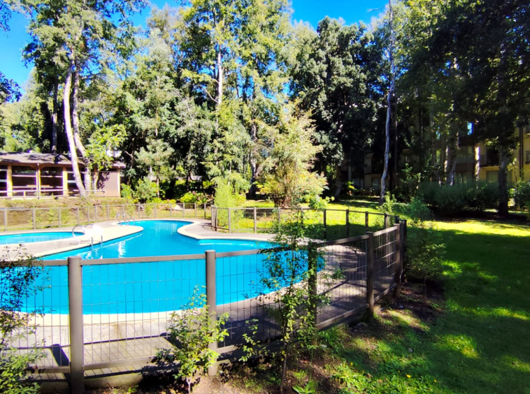 Departamento en ARRIENDO ANUAL en Condominio Nuevo Parque Suizo. El departamento cuenta con 1 dormitorio y 1 baño, cocina americana, agua caliente por termo eléctrico, cuenta con 1 Estacionamiento. Se arrienda full amoblado, sólo se necesita llevar sábanas y toallas. Dormitorios principal en suite, además, tiene acceso al baño por fuera del dormitorio en caso de contar con visitas. Departamento ubicado en piso 4 con vista al interior del condominio. El condominio cuenta con amplias Áreas verdes, bicicleteros, una gran piscina y 2 quinchos. La distancia es perfecta para caminar al centro de Pucón – Condominio con seguridad 24/7. Gastos comunes e internet incluidos.