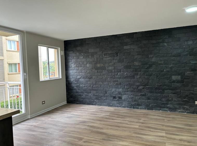 El living y comedor son amplios con una pared negra de piedra que aporta un toque moderno al ambiente.