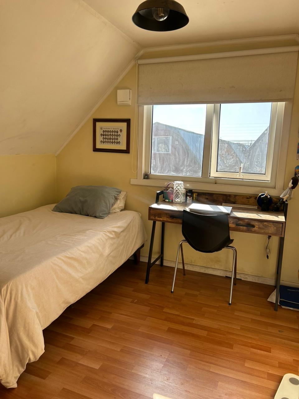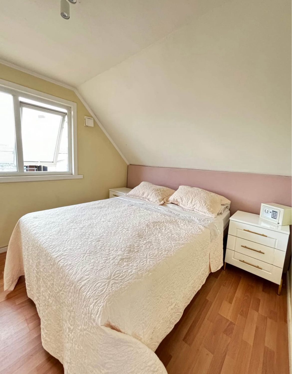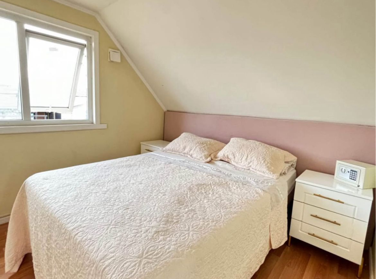 Segundo piso cuenta con un baño con tina, mueble vanitorio y espejo, 4 dormitorios con piso flotante nuevo de color claro similar a madera que la calidez al lugar.