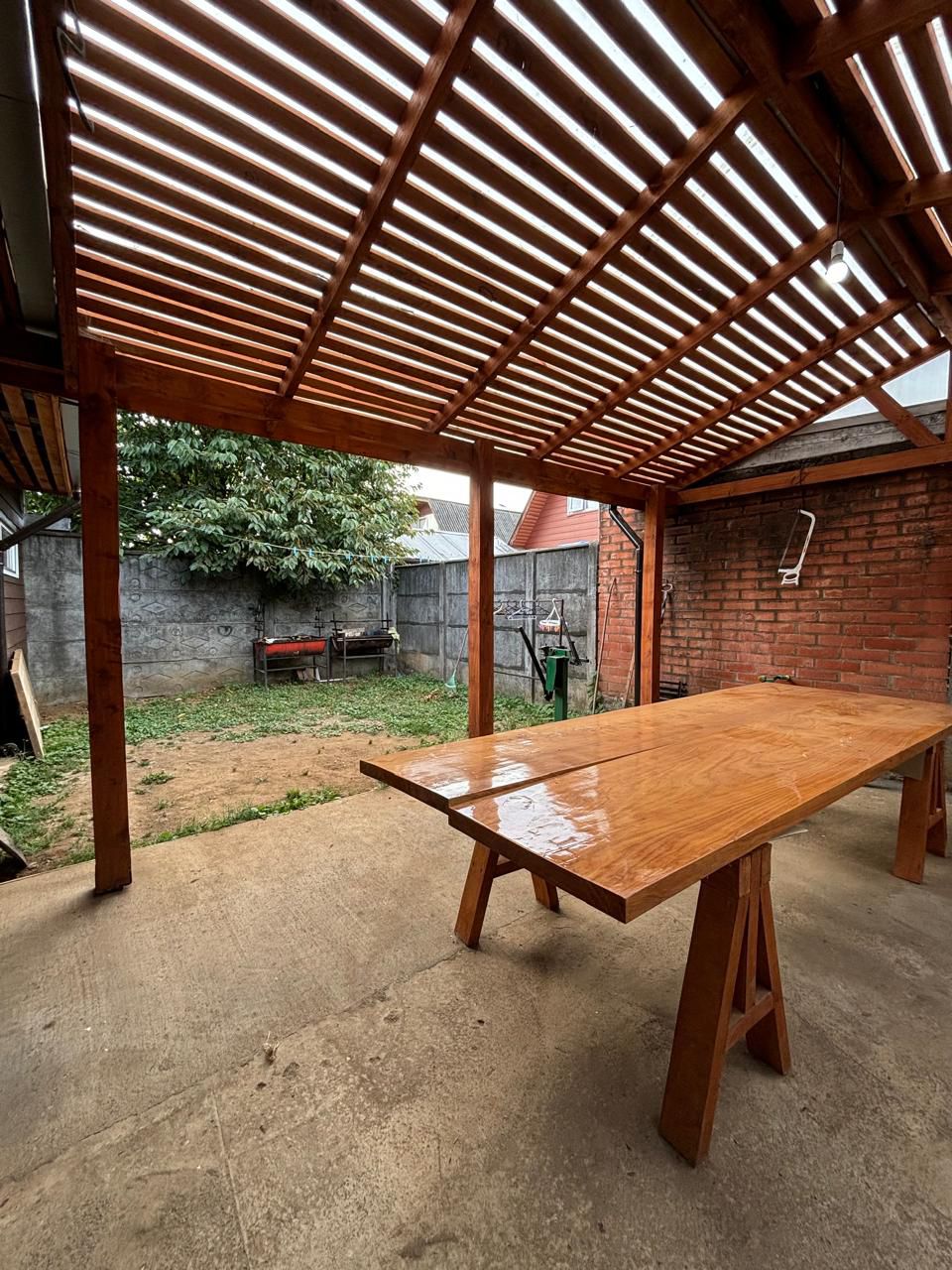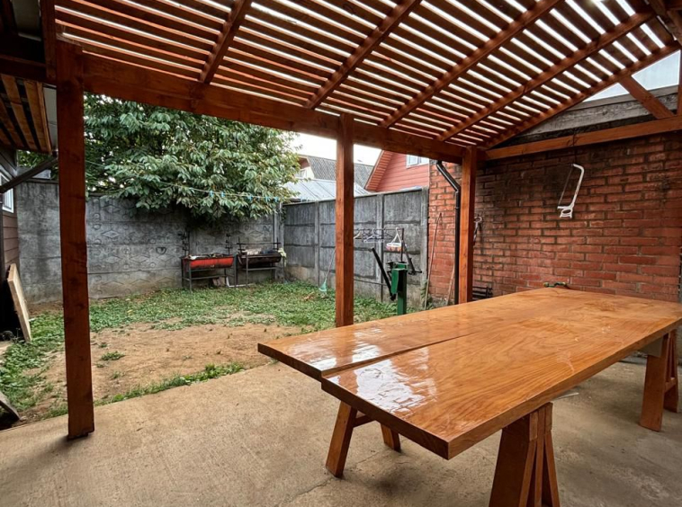 Posee quincho con vigas a la vista y entrada de vehículos para 2 autos.
